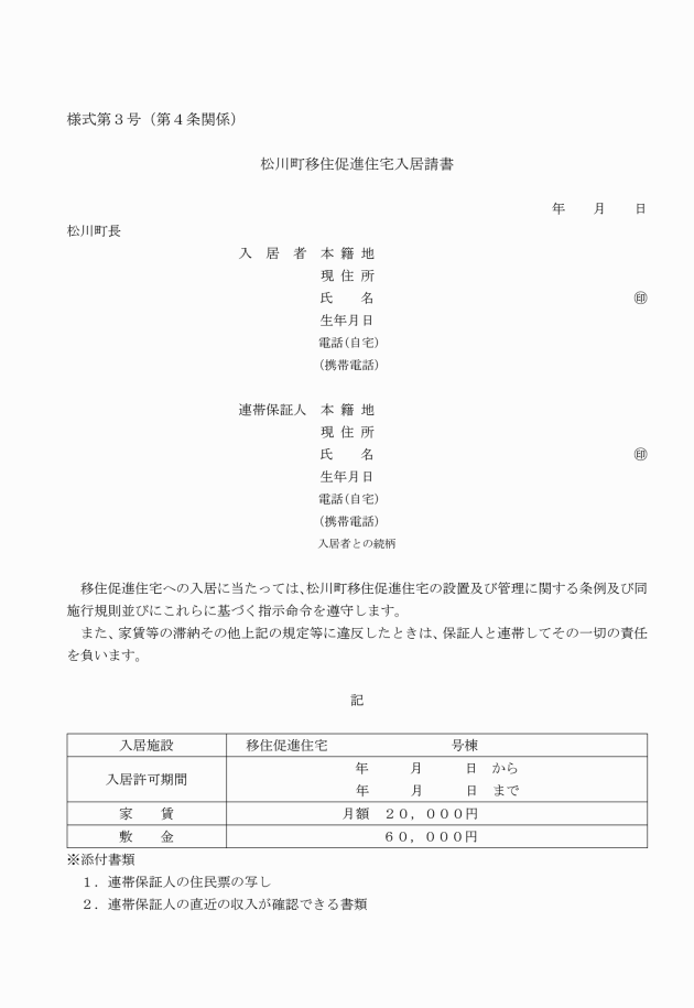 第4条 条例第6条第1項第1号に規定する請書は、松川町移住促進住宅入居請書(様式第3号)とし、次に掲げる書類を添えて、町長に提出しなければならない。
