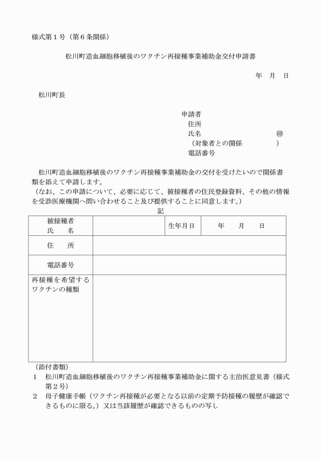 (1) 松川町造血細胞移植後のワクチン再接種事業補助金に関する主治医意見書(様式第2号)