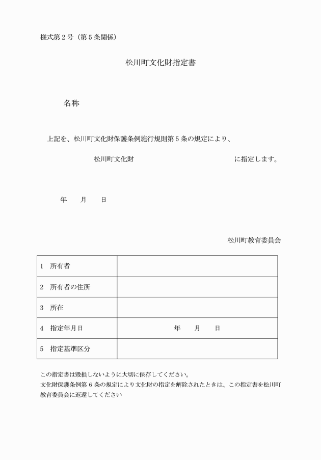 第1条 この規則は、文化財保護条例(昭和43年松川町条例第18号。以下「条例」という。)の施行について必要な事項を定めることを目的とする。