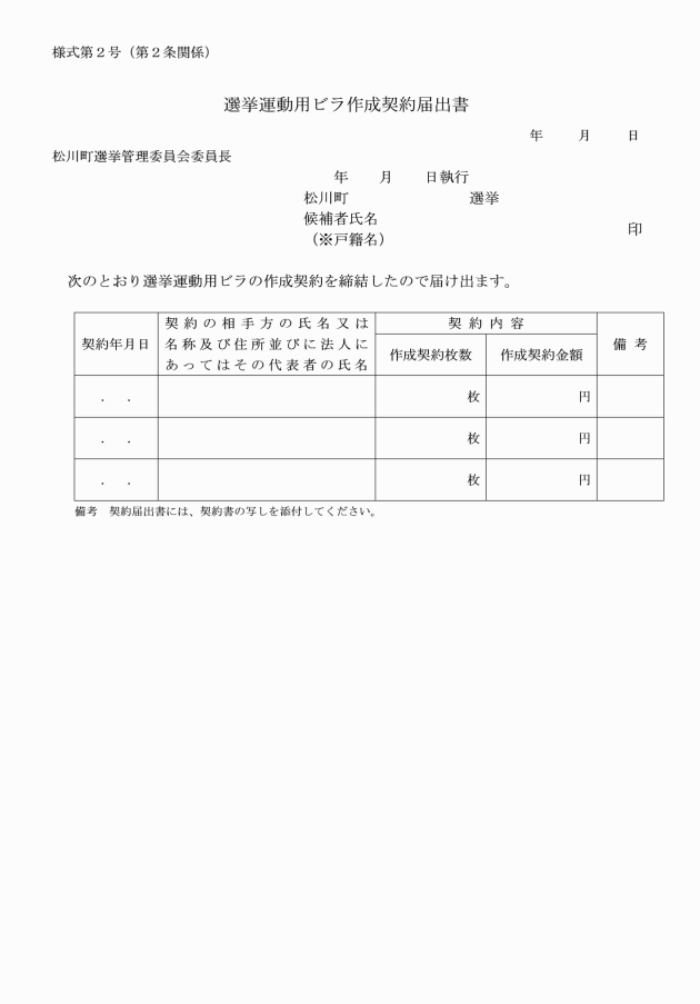 第2条 条例第2条、第6条又は第9条の規定の適用を受けようとする者は、条例第3条、第7条又は第10条に規定する有償契約を締結した場合には、直ちに(立候補の届出前に当該契約を締結した場合には、立候補の届出後直ちに)、当該契約に関する書面の写しを添えて、条例第3条、第7条又は第10条の規定による届出をしなければならない。