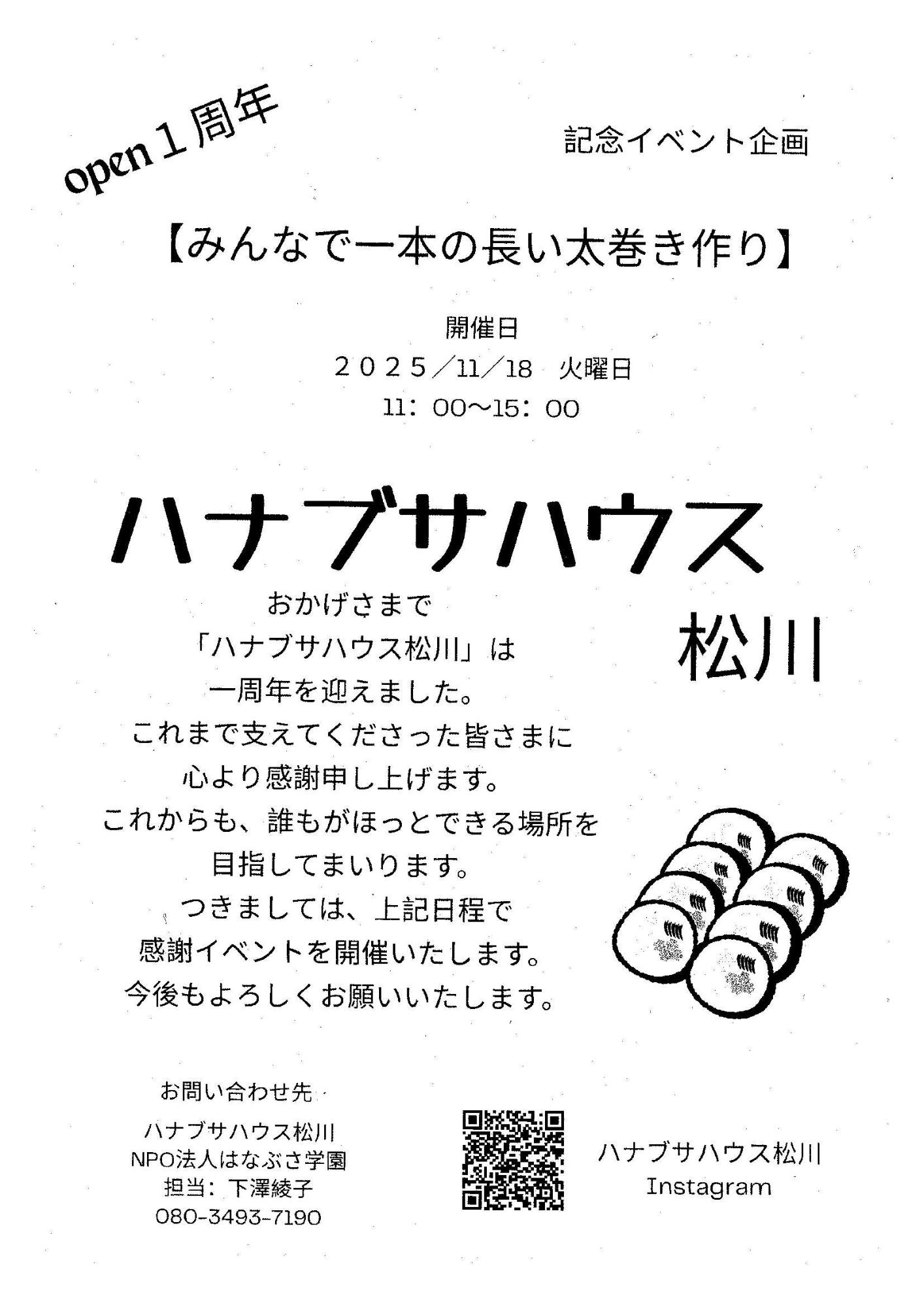 この度、イベントを11月18日(火曜日)に開催する運びとなりました。1周年に合わせて大きな巻き寿司を参加者の皆さんと巻いてお祝いします。