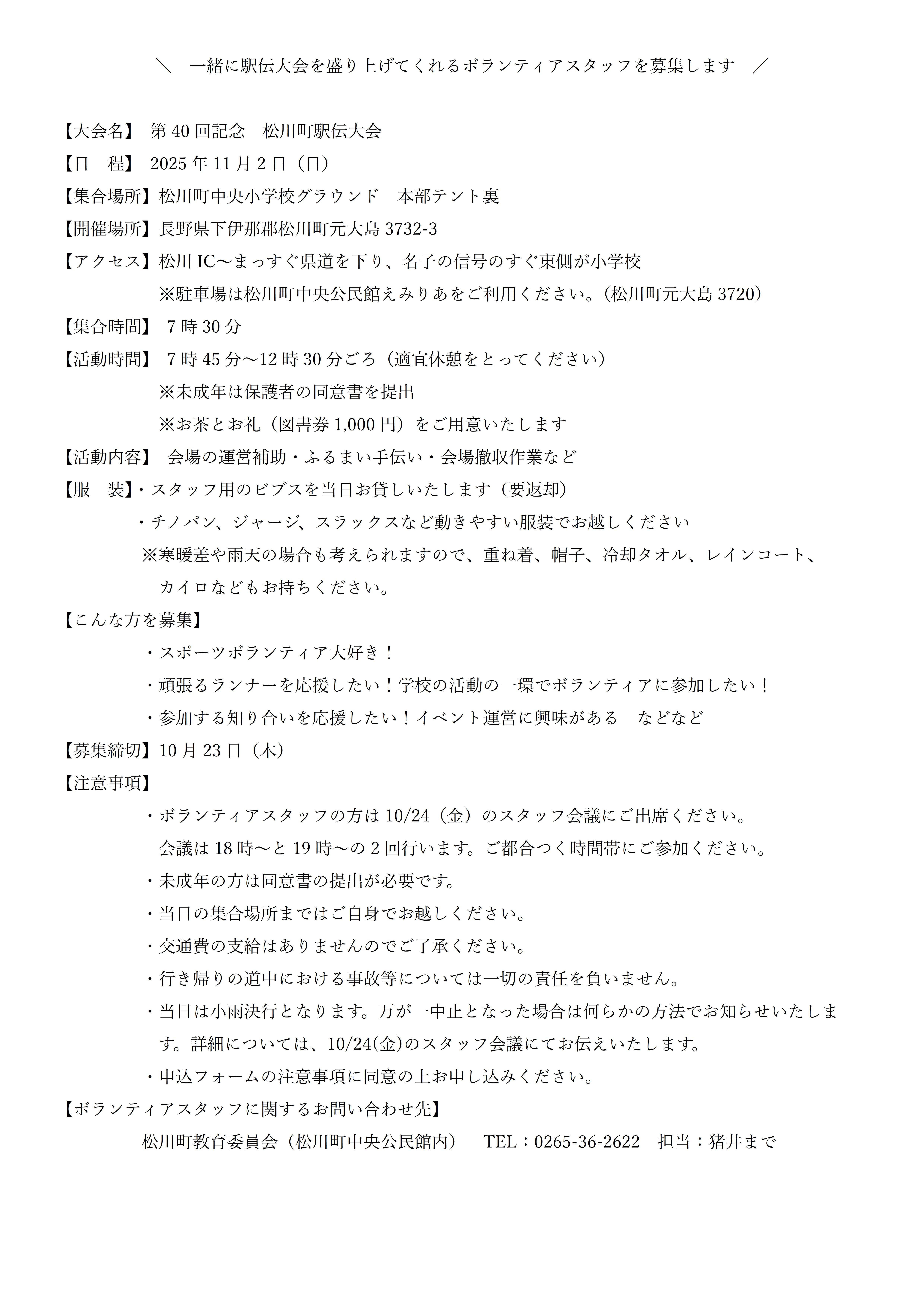 第40回記念 松川町駅伝大会 ボランティアスタッフ募集詳細 (JPEG: 1.4MB)