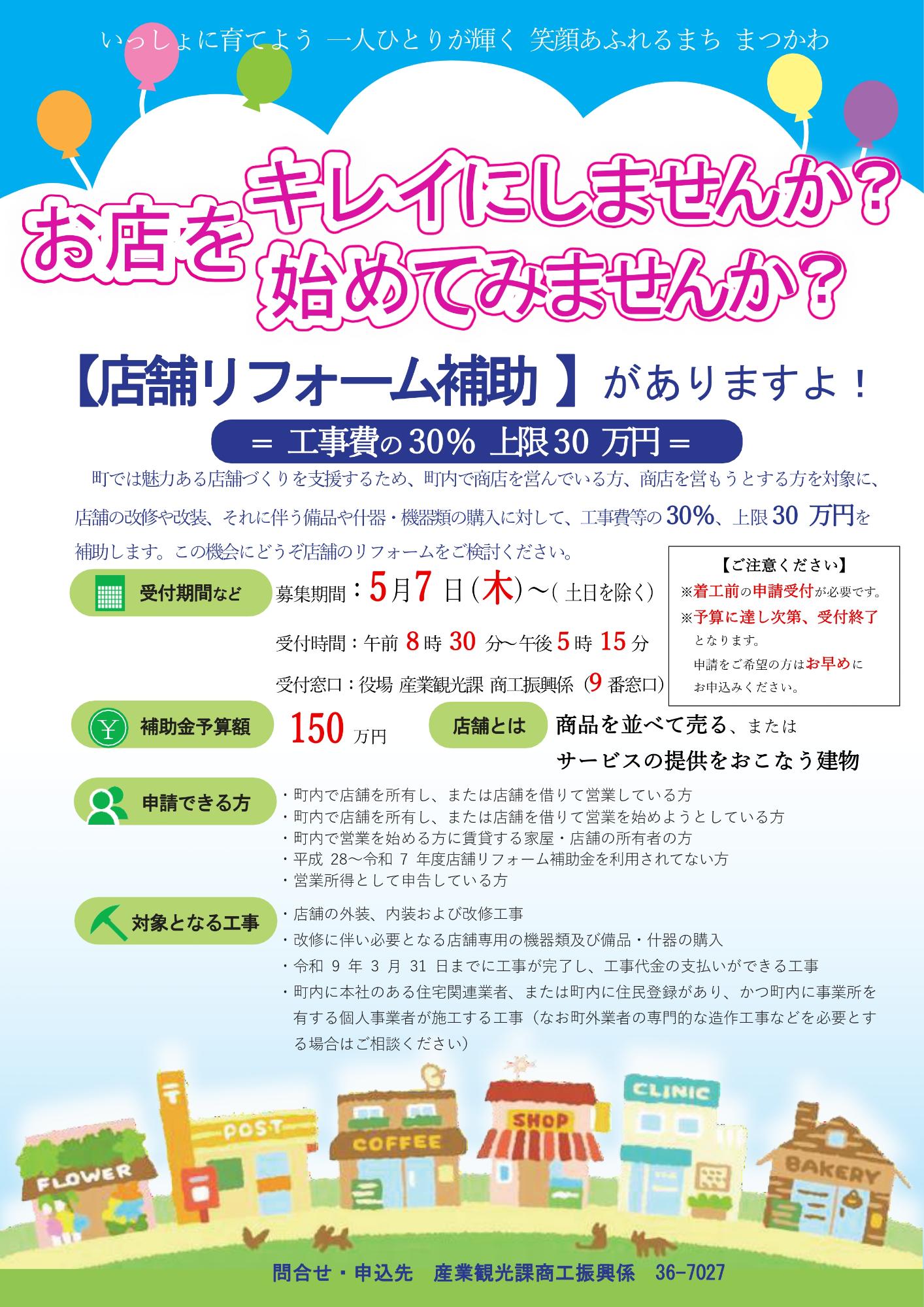 令和8年度 店舗リフォーム補助金 申請について 令和8年度の募集を5月7日(木曜日)より開始いたします。 詳細につきましては、添付資料をご覧ください。 関連書類 店舗リフォーム補助金 チラシ (PDFファイル: 1.5MB) 交付申請書 (Wordファイル: 13.5KB) 事前着手届 (Wordファイル: 20.4KB) 変更交付申請書 (Wordファイル: 21.2KB) 実績報告書 (Wordファイル: 13.4KB) 請求書 (Wordファイル: 14.4KB) この記事に関するお問い合わせ先 産業観光課 商工振興係〒399-3303長野県下伊那郡松川町元大島3823電話番号:0265-36-7027お問い合わせはこちらから 更新日:2026年04月07日 現在のページ ホーム 組織から探す 産業観光課 商工振興係 商工 産業振興 商業 令和8年度 店舗リフォーム補助金 申請について