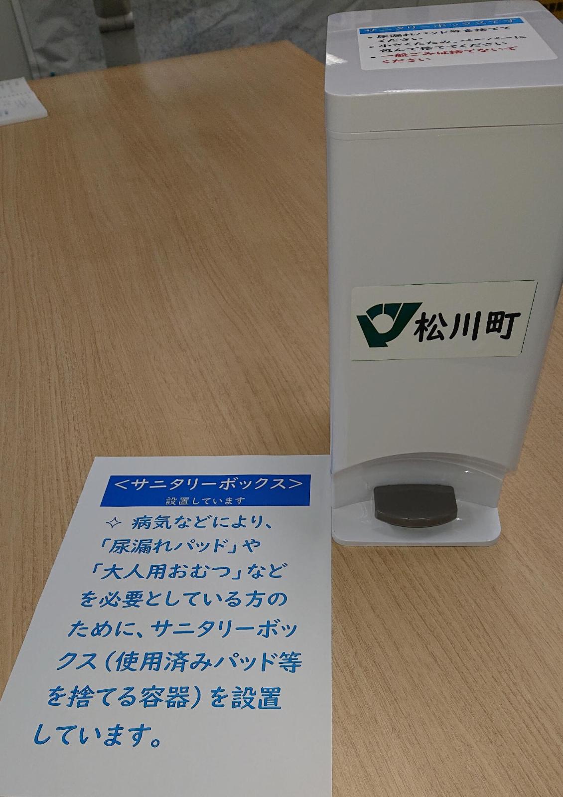 庁舎男性用トイレにサニタリーボックスを設置しました。 前立腺がんや膀胱がんの治療等の影響により、日常的に尿漏れパッド等を使用する方が、安心してご来庁いただけるよう、男性用トイレの個室にサニタリーボックスを設置しました。 町内の企業様や店舗様におかれまして本取組が推進されますよう、皆さまの御理解と御協力をお願いします。 関連リンク 総務課 まちづくり政策課 住民税務課 保健福祉課 建設水道リニア対策課 耕地リニア係 産業観光課 教育委員会事務局 生涯学習地域共生係 議会事務局 地図(Googleマップ) 大きな地図を見る(GoogleMapページへ) 松川町役場 この記事に関するお問い合わせ先 総務課 総務係〒399-3303長野県下伊那郡松川町元大島3823電話番号:0265-36-7021お問い合わせはこちらから 更新日:2026年04月13日 現在のページ ホーム 組織から探す 総務課 総務係 松川町の紹介 庁舎男性用トイレにサニタリーボックスを設置しました。